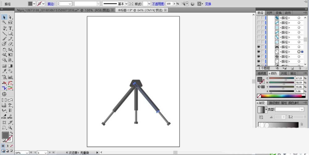 用灰黑色与灰色搭配填充三角架的暗区与亮区的路径。