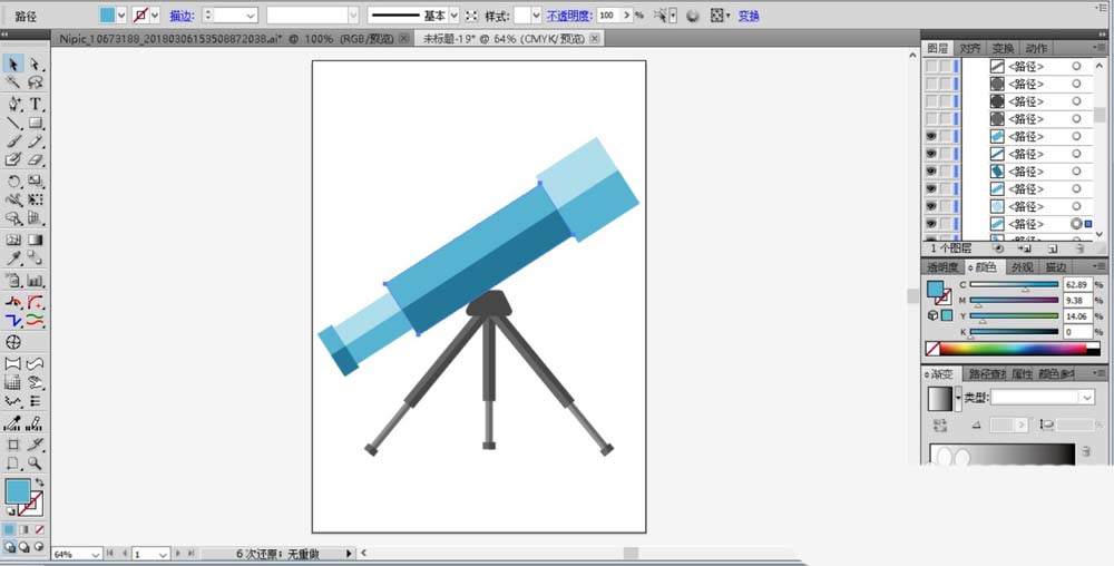 再用海蓝色与天蓝色搭配填充天文望远镜的主体路径,让望远镜的中间的海蓝色,两端为天蓝色。