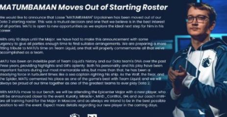 Ti7冠军队伍Team Liquid宣布自己队内一号位/二号位选手MATUBAMAN离队,也就是中国玩家经常说的马桶哥。自此,电竞史上维持阵容时间最长的五人组Team Liquid也就此终结。他们组队时间足足高达890天,而马桶哥则是为Liquid效力了1342天。他们曾经一起捧起过Supermajor的奖杯,也在Ti7上面上演了首轮跌入败者组最后决赛3-0战胜对手捧盾的好戏。不过这些都已经是过去式了,Liquid也并没有公布自己的新任中单,或者是一号位(因为奇迹哥位置并不确定)。但可以肯定的是,DOTA2历史上一个传奇阵容就此终结。