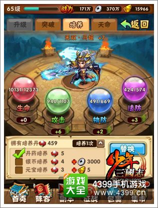 另外,宝物要精炼全部2级以上哦~至于武将培养那方面,每天记得在竞技场里换满培养丹,然后优先培养满缘的武将(一般就是你的一号核心),培养点5个一次,一次一次的培养是最好的~