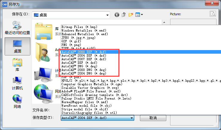 打开DXF或DWG文件后,选择“文件”里的“另存为”命令,打开另存为对话框。