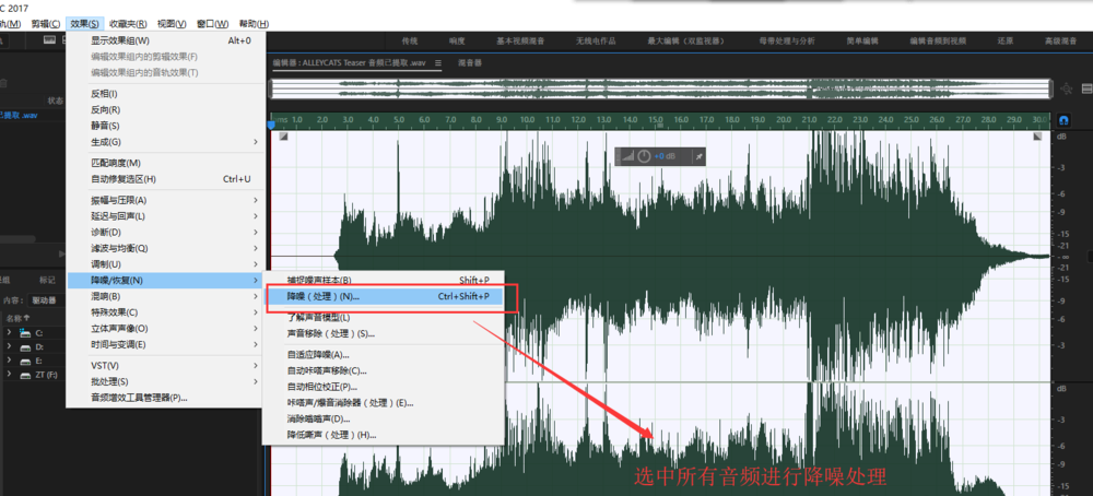 然后选中整个音频,执行【效果】菜单中的【降噪/恢复】——【降噪处理】命令,