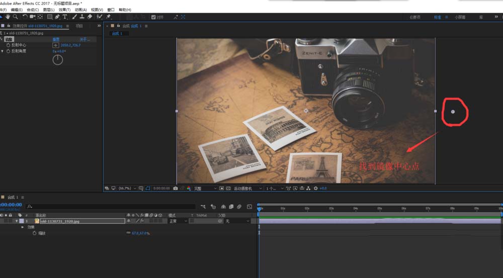 最后我们直接移动中心点或者在效果控件中通过反射中心的参数来调整中心点的位置,将中心点移到图片中心位置,这时候我们就看到图片以中心点左右镜像的效果了。
