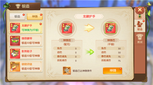 第一次神铸是不需要消耗任何材料的,可直接升到千锻这个级别~升为千锻,武器和首饰可增加伤害、念攻、暴伤加成和技能伤害这些属性,而其他部位的装备升为千锻,则增加免伤、念防、暴伤减免和技能减伤这些属性。