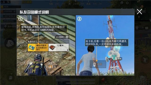 这个特定条件是什么呢?从上图中我们可以简介,玩家需要在规定的时间里拾取到被淘汰队友盒子中的身份识别卡,然后通过通讯塔召回已经成盒的队友,相信大家已经大致明白这个模式的玩法了吧,不过大家需要注意的是,被淘汰队友盒子中的身份识别卡只会存在120秒钟,时间过了只有就无法召回队友了。