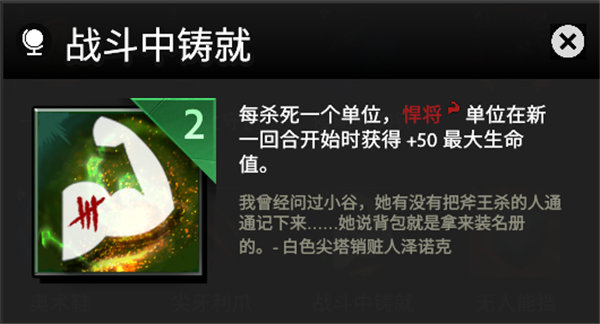 无敌兽王流的核心就是悍将的天赋战斗中铸就,很多人看到这个天赋都以为+50血没什么用,但是这50血是永久提升的,也就是说这回合击杀敌人所加的血量会一直累积到游戏结束,这就是养成无敌兽王的关键点。