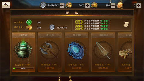 捐献:玩家加入到军团后,可以通过捐献功能,获得对应的属性值,从而提升自己的战斗力!捐献的属性是一直存在的,不会因为玩家离开军团而消失!