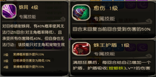 技能效果:对目标喷射蛛网,有40%概率使其无法行动5回合,且承受所有伤害降低40%,但自身也无法行动;该技能只对主角和宠物生效
