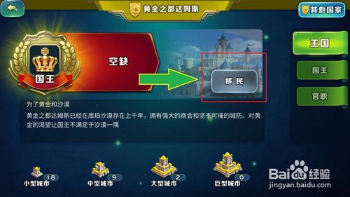 进入国家界面后,在中间的位置有一个【移民】按钮,点击他进行换国。
