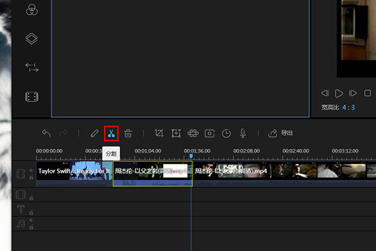 2、如果你同时导入了多段视频,那么视频的总时长将会达到一个惊人的数字,如果你想制作小视频,则需要将视频的内容进行裁剪,移动时间轴上的时间线,将其拖动到想要分割的时间点,点击上方功能栏中的“分割”选项,大家可以进行多段时间点的分割,知道选取到自己满意的内容为止,如下图所示:
