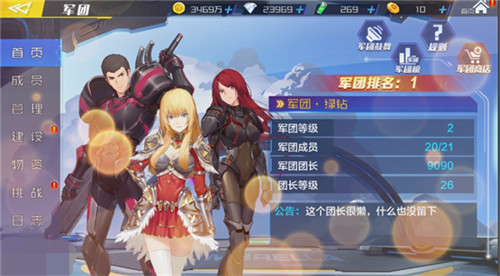 首页:就是可以看到军团的一些基本信息,比如军团等级,军团排名,成员数量,团战信息以及军团公告等