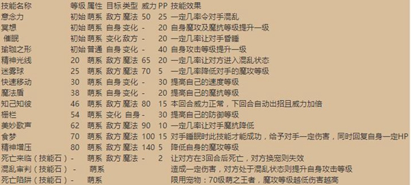 技能名称:意念力、冥想、催眠、瑜珈之形、精神光线、迷雾球、快速移动、魔法盾、知己知彼、栅栏、美妙歌声、食梦、精神增压、死亡来临(技能石)、混乱审判(技能石)、死亡陷阱(技能石)。
