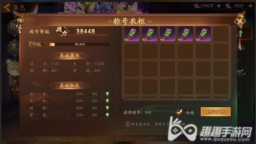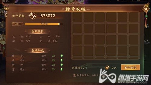 刀剑情缘称号衣柜界面只显示当前已激活称号及其属性总和,不显示未激活称号;称号衣柜开启后初始等级为0级,满级为50级,每升一级,都能百分比提升所有已激活称号的属性。