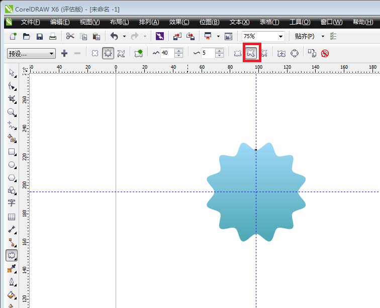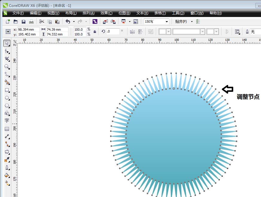 设置完圆形后,选择工具箱中“变形工具”,点击完成。在属性栏中选择“拉链变形”,用标尺锁定圆形的中心点,点住鼠标往右边移,那么圆形就长出角来,再点击“平滑变形”,那么就角度会变得光滑。