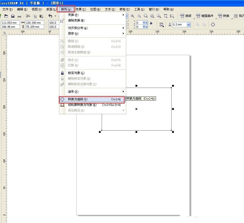 打开cdr软件。工具箱选择矩形工具,绘制一个矩形。点击菜单【排列---转换为曲线】。