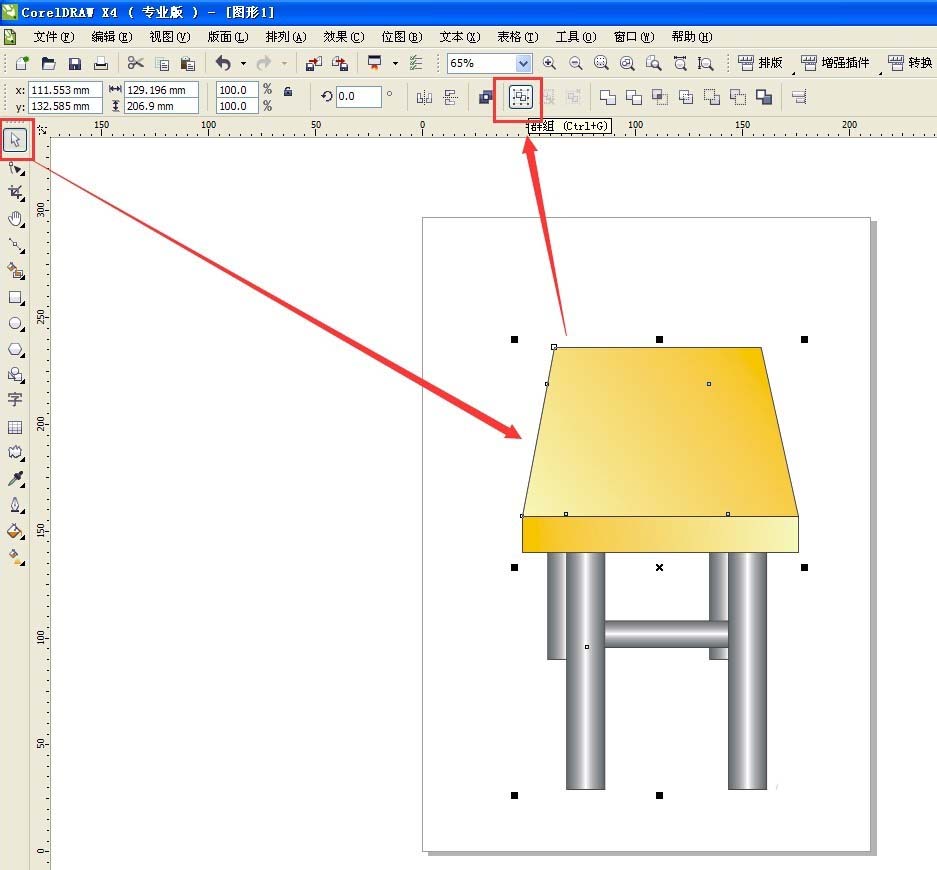 挑选工具框选所有的对象,点击属性栏的群组。