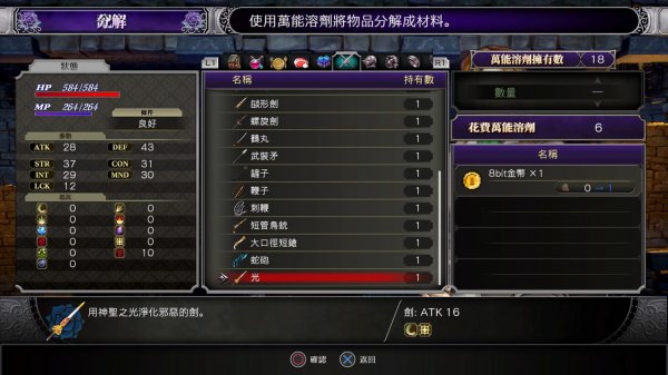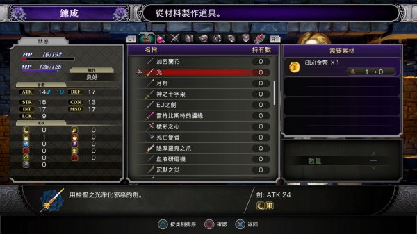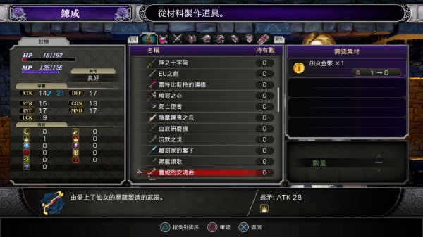 得到8bit金币之后可以去炼金术师处制作武器。有很多种类,可能你会犹豫要选那个才好,答案是随便选就可以,因为玩家可以随时将武器分解还原作8bit coin,只需要2支万能溶液,修女姐姐处有售(50元一支)(6月20日注:PS4 1.02版后改为800元一支)。所以不用考虑太多,觉得合眼缘的就制作吧。