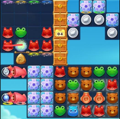 4、交换狐狸和花团,打爆花团,激活鱿鱼,落下莲花。