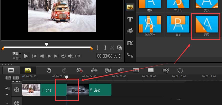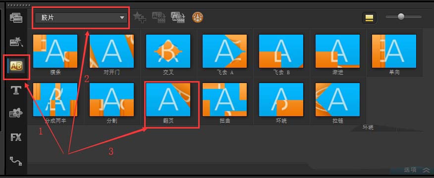 再点击转场这个选项,然后点击选择到胶片、最后选择翻页这个选项。