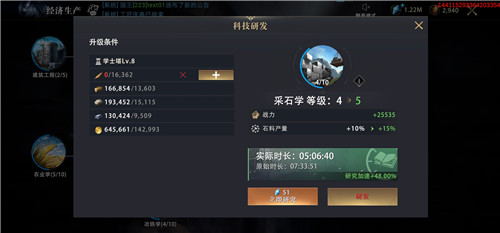 天赋相关的石工技术、科技相关的采石学等进行提升研究后可对应提升采石场石料产量、石料生产速度等。领主们进入[领主-天赋]、[学术塔-基础科技-经济生产]等界面即可对其进行强化提升。