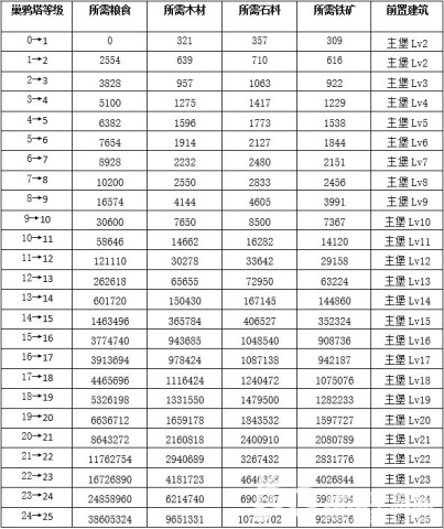 巢鸦塔的升级前置条件只有主堡等级作为限制,所需资源中,粮食的比例较高,升级难度相对较低,同时巢鸦塔的等级也是升11级、17级、23级主堡的前置条件,即需要10级、16级、22级的巢鸦塔才能够为主堡升级。