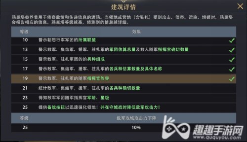 权力的游戏凛冬将至中的巢鸦塔与三国群英传霸王之业中的计谋府效果类似,是用来获取敌军资料的主要建筑,当有其他领主对你发起敌对行为,如侦查、进攻、集结都会触发巢鸦塔的警报。巢鸦塔等级越高,回馈的敌军信息越详细,而详细的敌军资料为玩家接下来的选择(硬刚、求援、藏兵或者免战)提供很大的帮助。