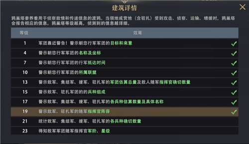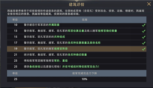 通过建筑详细我们可以发现,巢鸦塔的作用不止于侦察,当巢鸦塔升至满级时不仅可以为敌方套上越高强力的降攻DEBUFF,还能一键备战,颇为方便。推荐玩家们优先升级巢鸦塔,知己知彼,百战不殆。更多游戏资讯请持续关注58资源网,我们会实时发布最新最快的游戏攻略供大家参考。