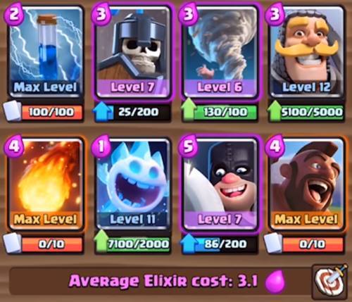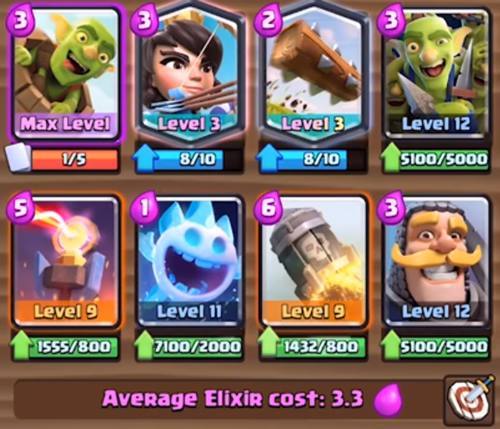 卡组的简单攻略:利用骑士当炮灰,跟进野猪骑士消耗对手防御塔,火球、小闪电以及飓风法术都可以看情形配合,小冰淇淋可以跟在野猪骑士身后,有时候也会打出不一样的效果来;飞斧屠夫可以优先用来防守,飓风法术和骷髅守卫都能配合他。