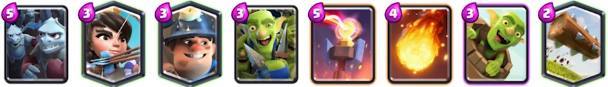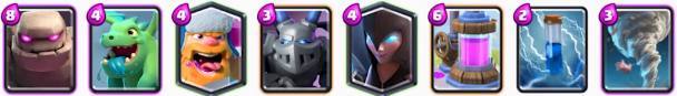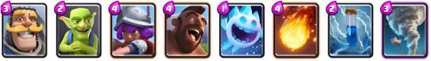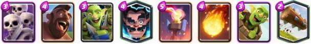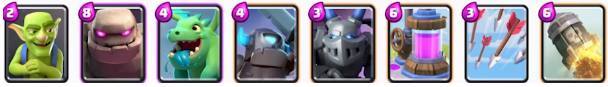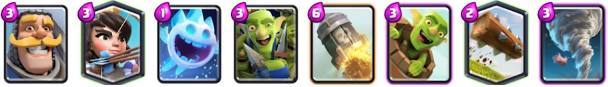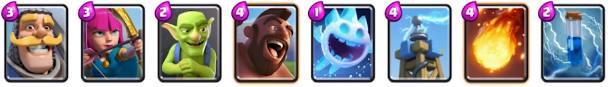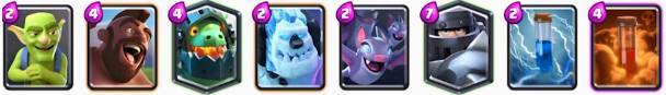 这套卡组是之前胜率非常高的组合,利用卡组内圣水低耗卡牌多的优势,快速刷新卡牌,利用飞桶和公主各种消耗对手防御塔,有机会还可以使用大火箭辅助,有地狱塔镇守,防御能力也不弱。