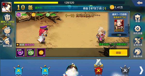 首先,我们通关了一个关卡之后,返回“征战界面”,我们可以看到,我们会自动在最近的一个通关关卡挂机,完全不需要动手操作,挂机这一玩法是系统默认进行的,十分方便。