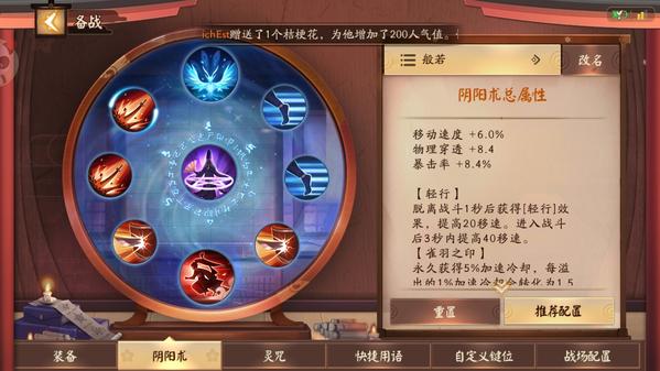 解析:我喜欢带暴击率摸奖,摸到一次非常疼。般若前期要放近战上单风筝,所以移速比较重要。物理穿透是因为上单一般都是守类式神。