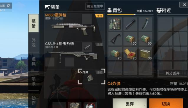 C4炸弹是可以远程遥控的高爆塑料炸弹,可以黏附在车辆等物体上对人员进行攻击!失效范围为80米。C4炸弹之所以能在新地图受欢迎,就是因为它的可控性强,可以远程遥控,80米内皆可控制其爆开!还可以黏在载具上面,这对于堵桥、埋伏的玩家们来说,简直是神器!
