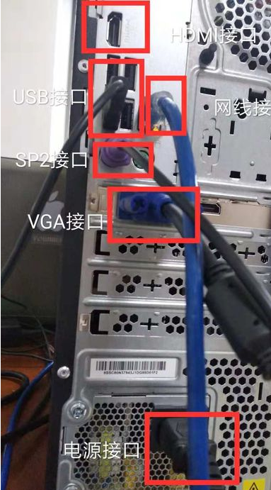 3、电脑主机的接口,如图,HDMI接口是高清接口可以连接高清显示设备哦,电源线另一头插到家里的插排上;