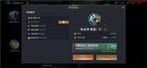 研究木材生产相关的科技与提升木材生产相关的天赋都能大幅提升伐木场木材产出效率。领主们在[领主-天赋]、[学士塔-经济生产]等处进行相应强化即可使伐木场产出更多木材资源。