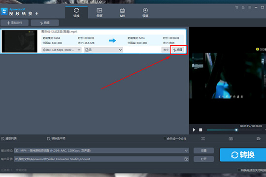 1、首先需要先进入到Apowersoft视频转换王的软件界面中,成功导入想要替换文字或字幕的视频后,开始编辑,如下图所示: