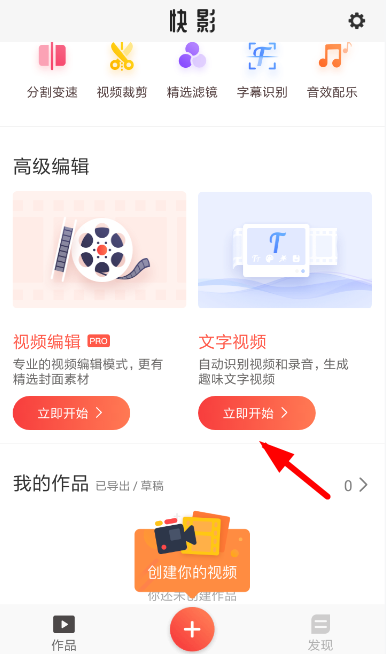 1、其实提取“音频”的方法并不复杂,大家点击快影主页的“文字视频”按钮进入到提取页面(如下所示),这样才能继续下一步设置。