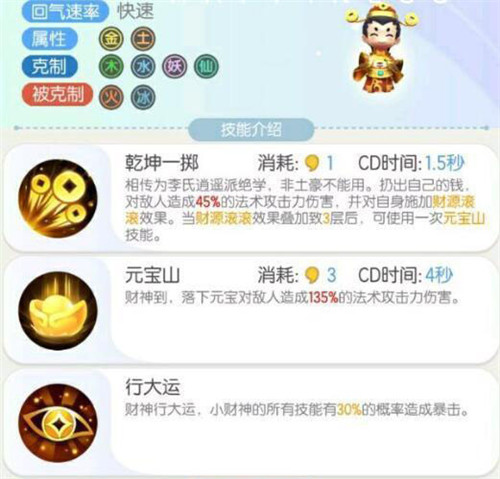 金土属性的小财神,继承了金属性的暴力输出的特征,一技能累计三次之后解锁二技能,二技能初级伤害为135%的法术输出,被动技能增加所有技能30%暴击率。总结就是:简单暴力,使用方法跟红玉相差无几。