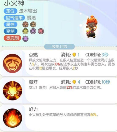 火土属性的小火神,就像是一团熊熊烈火一般绵延千里,需要重点提及的是小火神的被动技能,对处于眩晕状态的敌人有额外60%的伤害加成。这样一来,小火神配合星日马和酒狐组成的“眩晕三剑客”,这个固定阵容绝对将会是擂台新星。
