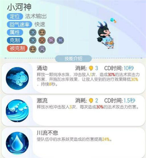 水土属性的小河神,系统定位是法术输出,实战应用多用作“挂件妖灵”。因为她的输出能力并不突出,但是被动技能为水属性提供的额外24%的伤害加成,将会让她成为第二个“水系元素之灵”。