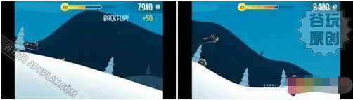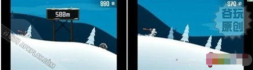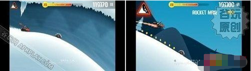 这里的加速指的是中上方的速度条,最大可以x8,也就是八倍速。当然这不是指你的游戏速度快了八倍,而是说你滑雪时速增加了,每秒走过的路程数大大增加。加速的方法有很多,除了动物可以为你增加速度以外,假如你做了一个完整的后空翻,就会为你加一级速度,这一般是在陡坡处滞空时间较长的时候进行的,在着陆的一瞬间会喷出黄色火花为你加速。