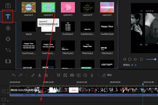 然后默认处于“素材”的窗口栏,需要点击红框标注内的“文字”选项找到相关字幕的各种样式,可以点击某个素材字幕上的“+”号选项,也可以将字幕拖动到下方的时间线上,这两种操作都是可以添加字幕的,如图所示: