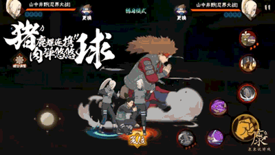 井野把手放在鹿丸头上感知相传,随时观察敌人。鹿丸用影掴术控制丁次定向使出肉弹战车,对敌人进行滚动式打击。猪鹿蝶完美的配合。