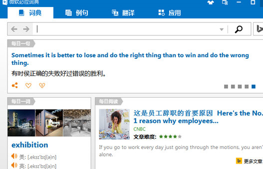 1、首先需要先进入到微软必应词典的软件中,在词典界面,用户可以看到软件为用户所推荐的每日一句与每日阅读等内容,如下图所示: