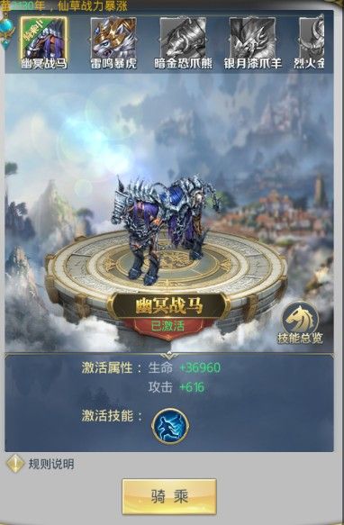 玩家在开局的时候会获得一个坐骑,不要小看这个坐骑这个给玩家的各个角色都增加了不同的属性的。玩家可以收集碎片来合成不同的坐骑,目前宗门有一个可以收集还有黑市也会刷新碎片。其他的坐骑要钻石来购买,当然土豪的话当然不会在意这点钻石的。