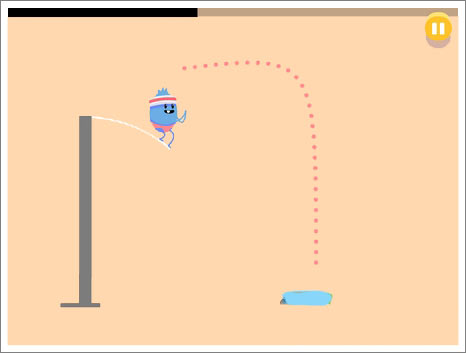 在蠢蠢的死法2跳水这一关中,可以看到地上的泳池只有很小一块,玩家需要按住屏幕,中间会出现粉色虚线,当虚线正好对准下方的泳池时松开,即可跳入其中。如果没有瞄准则会掉下来摔死。
