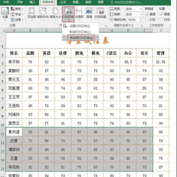 3、框选一个打印区域后,还可以继续添加打印区域,单击【打印区域】,在弹出的菜单中选择【添加到打印区域】;