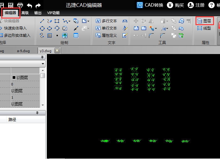 1.用迅捷CAD编辑器中打开CAD文件后,在界面上方选择“编辑器”,然后在右侧找到“图层”,点击打开图层窗口。