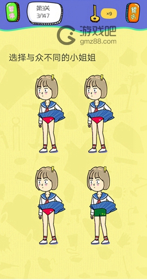 这一关将会出现4个看上去一模一样的女孩,题目要求是:选择与众不同的小姐姐。玩家需要将手机甩动一下,就会露出一名小姐姐的内裤与其他三名不同,选择内裤不同的小姐姐,即可通关。