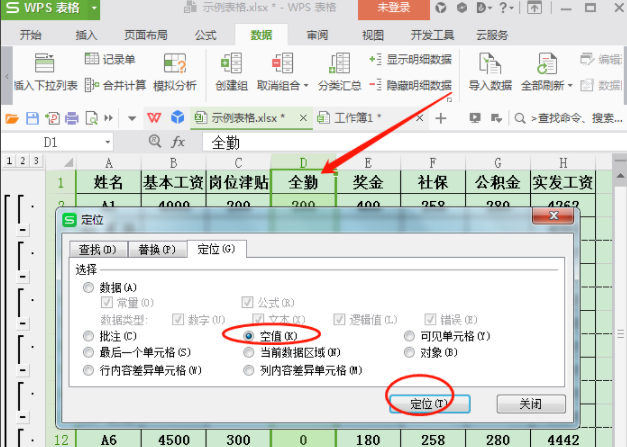 5、如果需要将汇总一行删除,选中任意一列,点击ctrl+G,然后选中【空值】,点击【确定】;