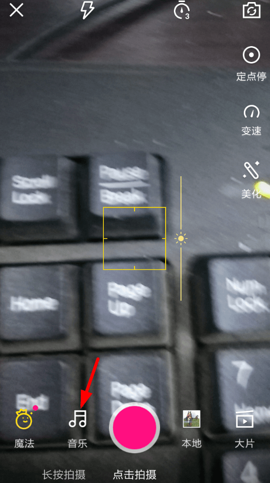 1、其实现在要想修改微视里的背景音乐,用户们就需要先点击下方的拍摄按钮,进入拍摄页面后通过“音乐”功能进添加设置。